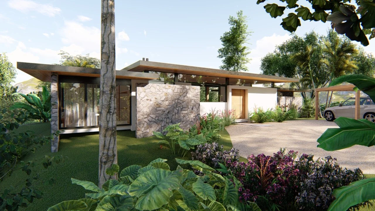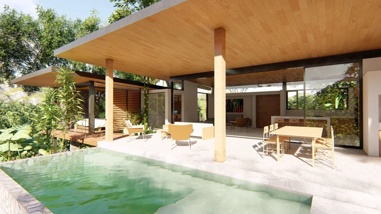 Al entrar en el cuerpo principal de la casa, las áreas de servicios se posicionan opuestas a las vistas, y los espacios sociales se integran al paisaje tropical a través de las terrazas, el jardín y la piscina.
