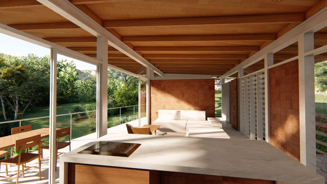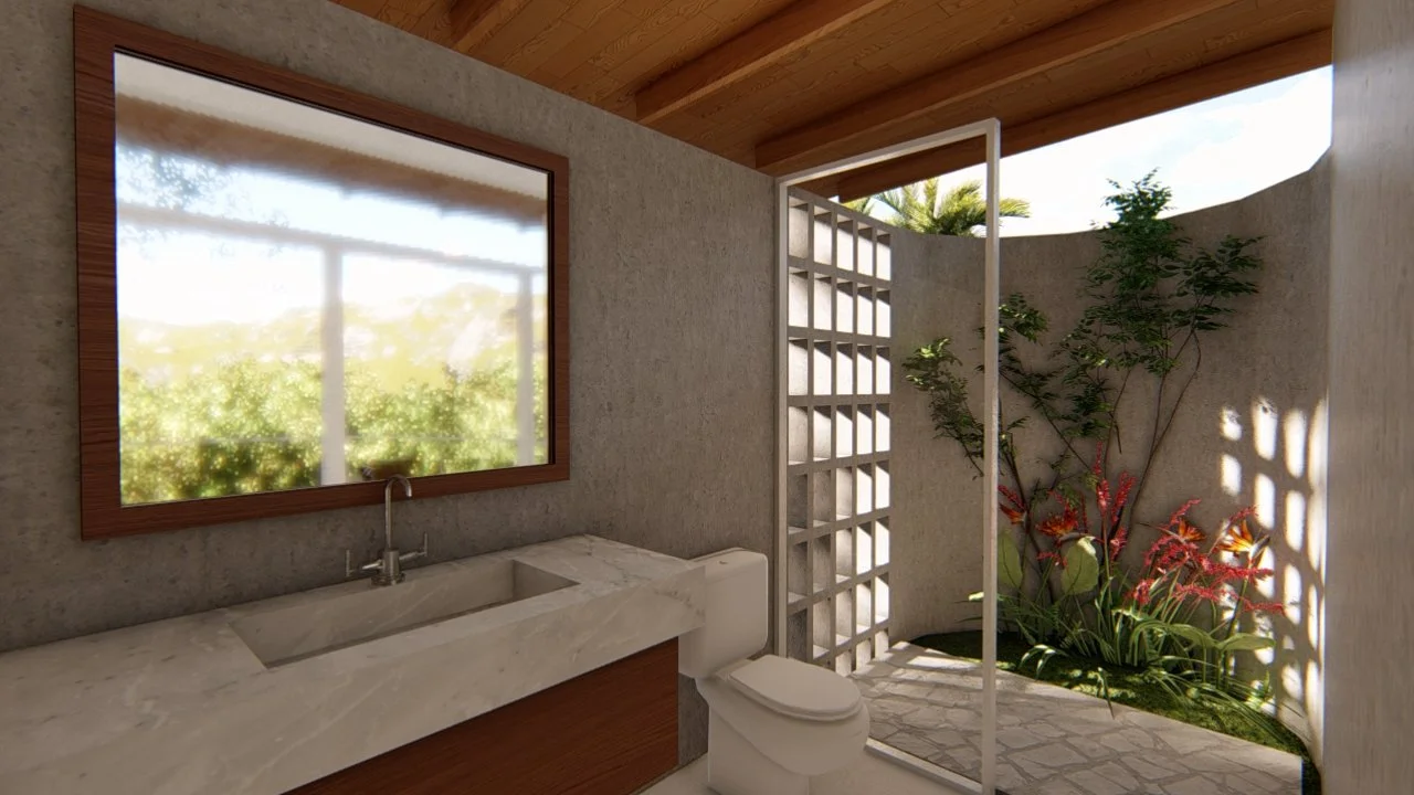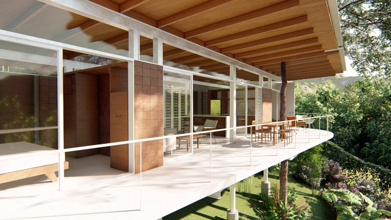 Al entrar en el cuerpo principal de la casa, las áreas de servicios se posicionan opuestas a las vistas, y los espacios sociales se integran al paisaje tropical a través de las terrazas, el jardín y la piscina.
